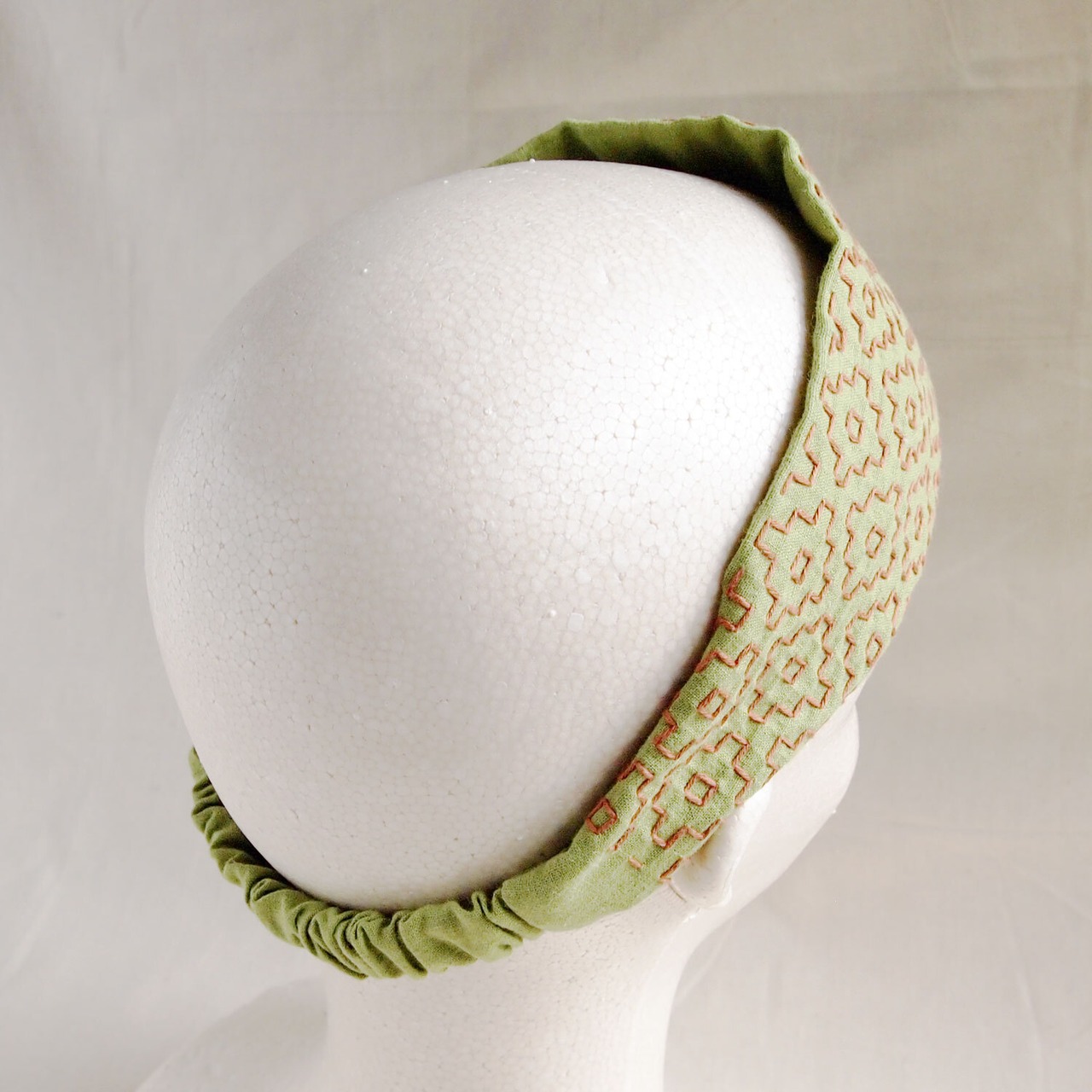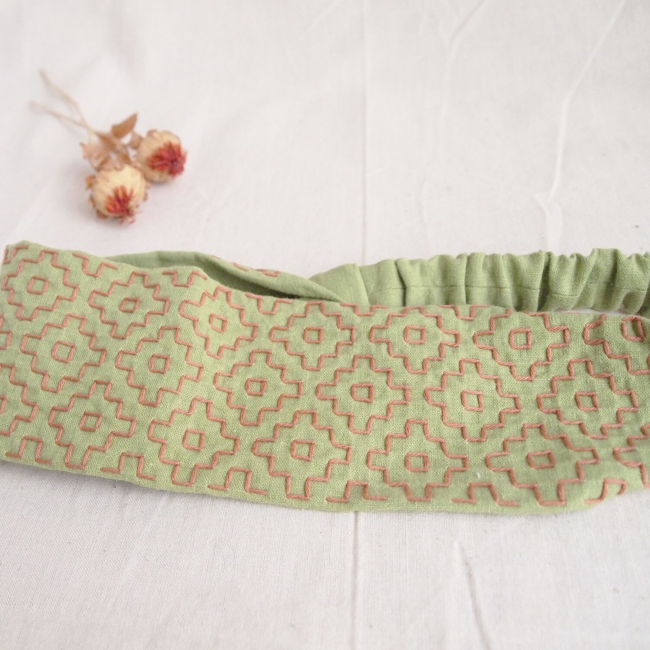 草色のコットンリネンに茶色の刺し子したヘアバンドです。