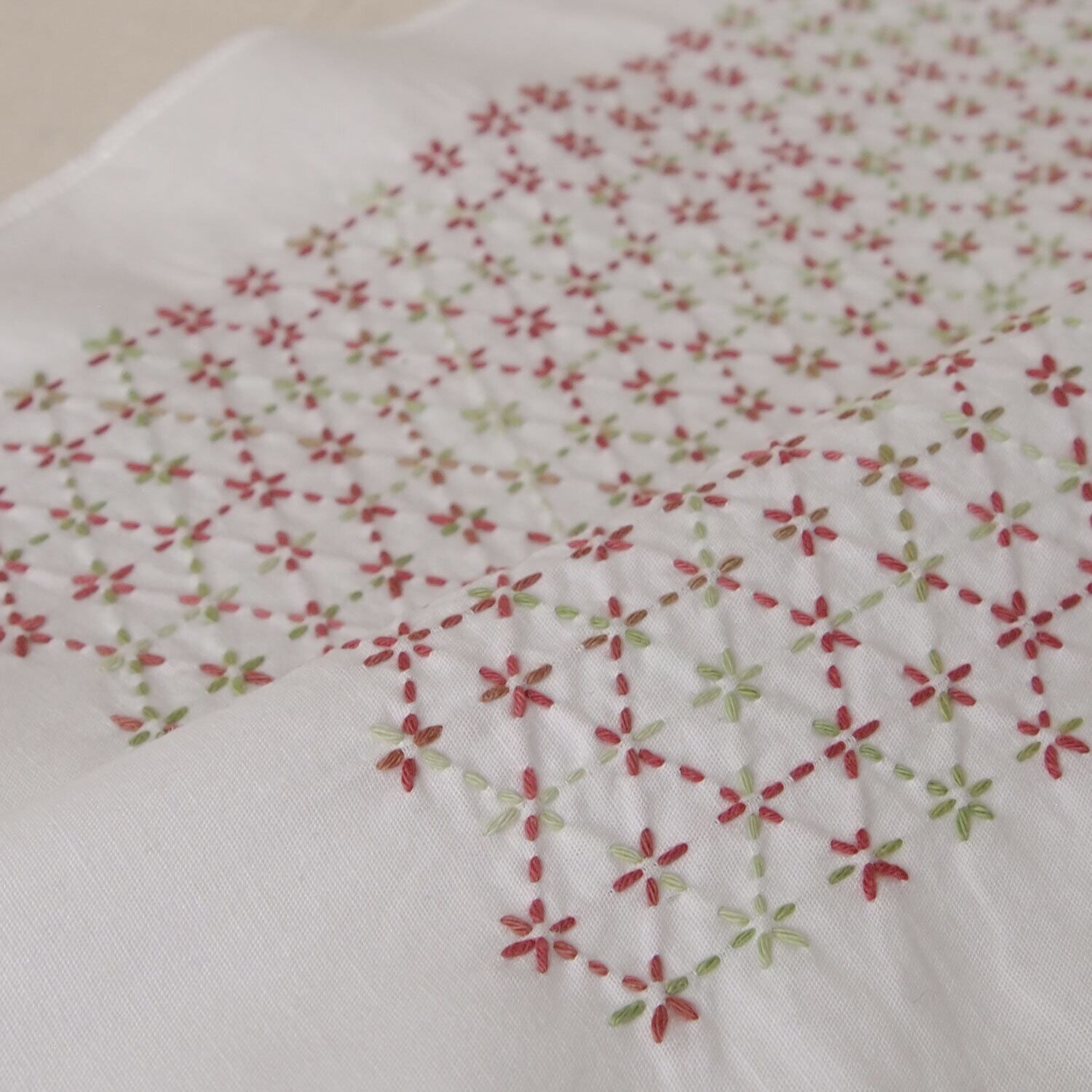 白のコットンに茶色と緑色の段染め糸で刺し子した半襟です。